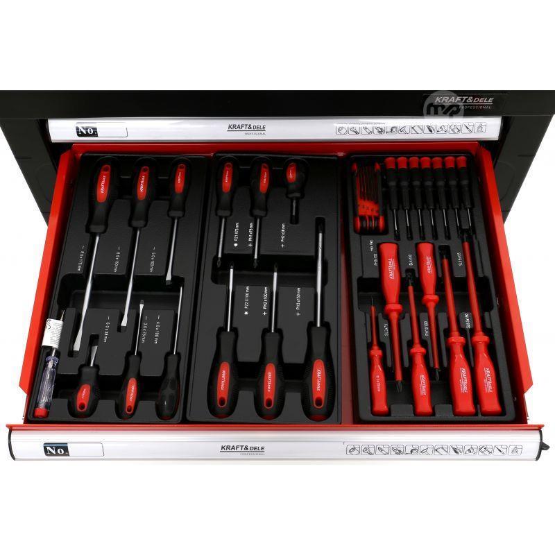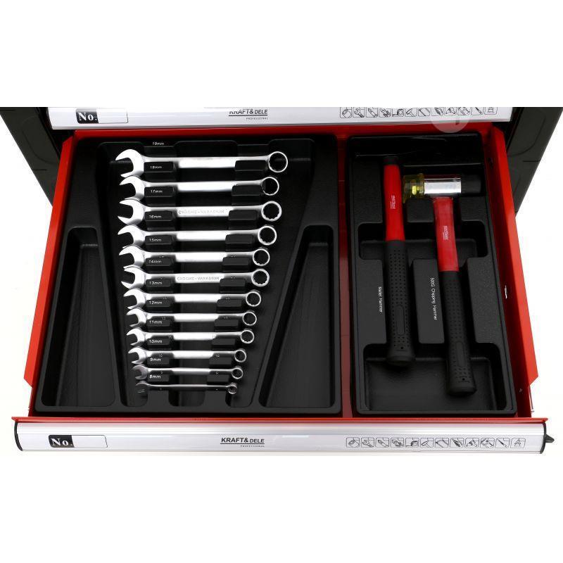 The KD361 is a professional tool cabinet from KRAFT&DELE, ideal for automotive workshops, service centers, and home garages. Equipped with 263 high-quality components and six spacious drawers, it provides a complete set of tools essential for everyday work for mechanics and DIY enthusiasts.