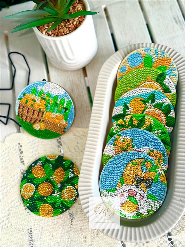 A touch of Mediterranean charm and vibrant elegance to your home with this beautifully handcrafted diamond painting coaster set. Inspired by fresh lemons, greenery, and cheerful spring-summer aesthetics, each coaster is decorated with shimmering diamond crystals that create a stunning mosaic effect. The sparkling details catch the light beautifully, turning everyday tableware into a small piece of art. Each coaster is carefully finished by sealing the diamonds with a high-quality protective coating, designed to withstand heat and everyday use.