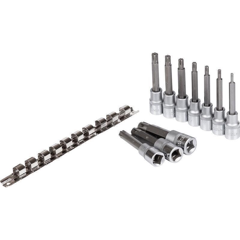 Set of 10 RIBE hexagon keys with ½” handle in the size range M4-M16 placed on a metal rail.
