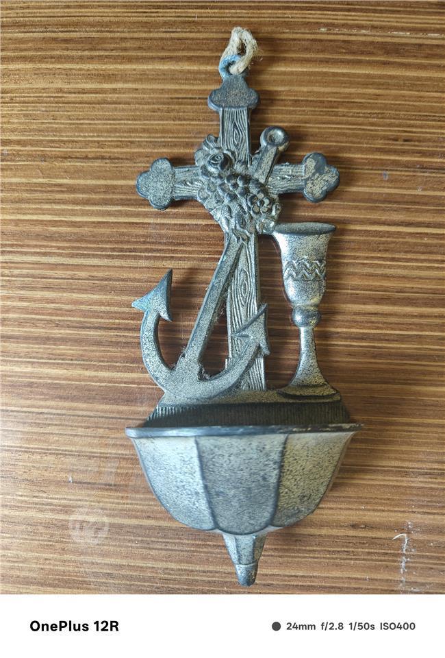 HOLY WATER FONT VESSEL, SPELTER, CRUCIFIX CHALICE ANCHOR. WALL HANGING COLLECTOR.