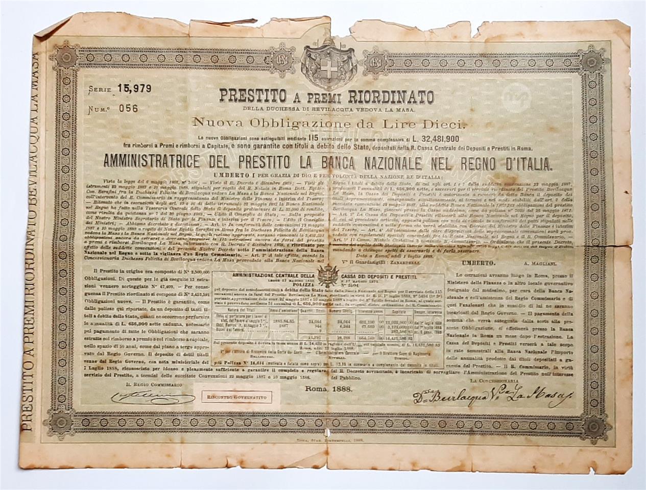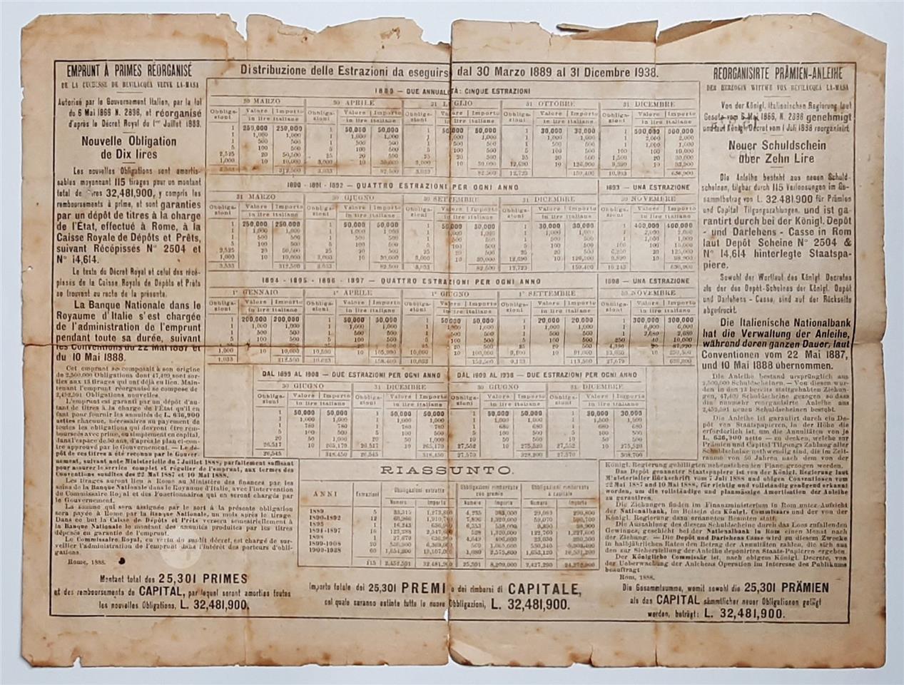 ANTIQUE ITALIAN DOCUMENT - "PRESTITO A PREMI RIORDINATO" 1888