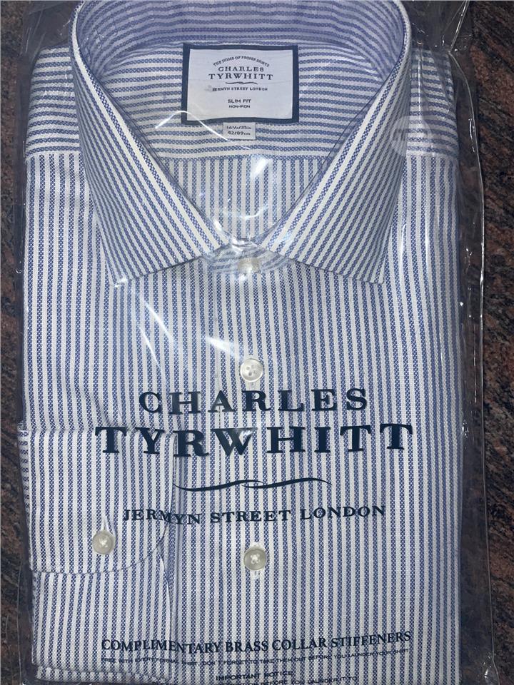 White/blue business casual non-iron cotton linen slim fit shirt. Brand new, still in bag. 2 blue and 2 white available, all in size 16.5 inches (collar) and 35 inches sleeve length.