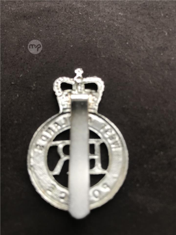 Cap badge with slotted pin fastener and the Queen's crown.