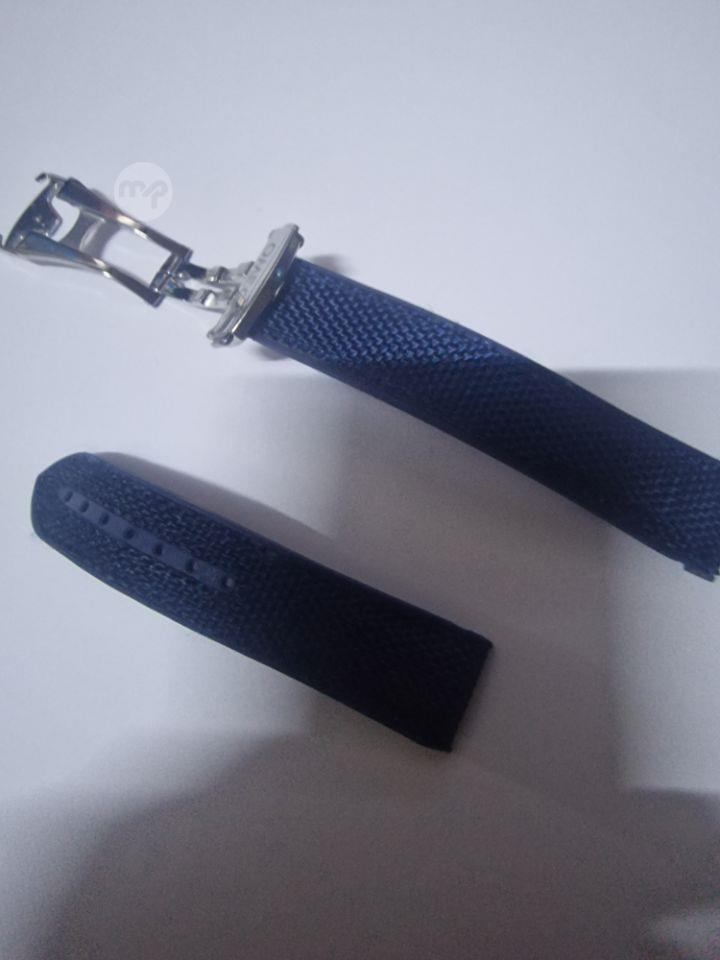 Omega blue nylon watch strap 20mm with curved ends & logo on the buckle. Suitable for both Speedmaster & Seamaster. Sports look. P.M. 99264520