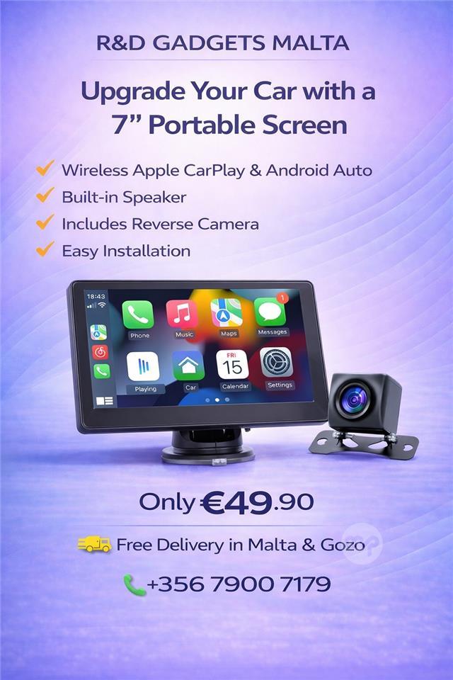 This 7” portable touchscreen brings modern features like wireless CarPlay, Android Auto, Bluetooth, voice assistant, and a rear camera to any car — instantly.