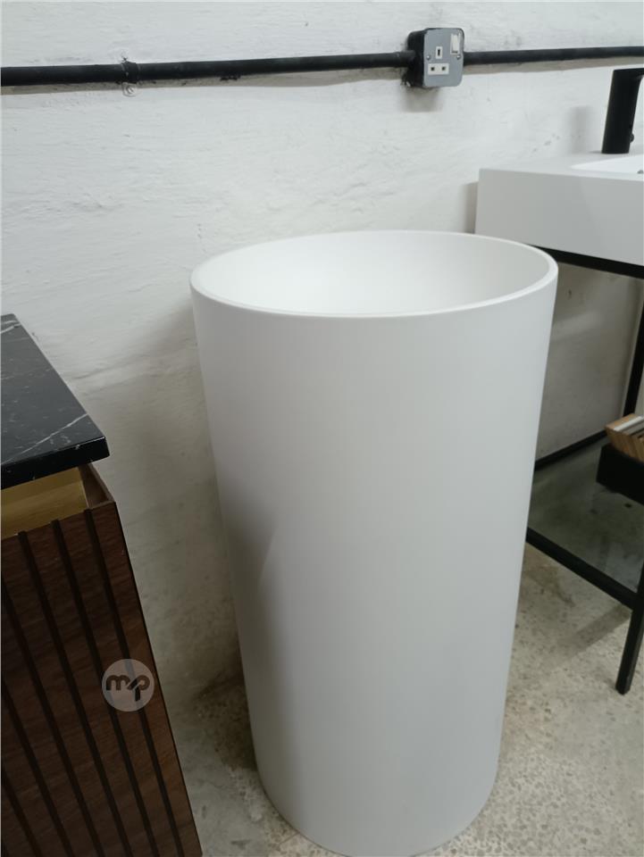 NEW Solid Corian freestanding wash hand basin made in Spain by leading designer brand Decosan. 45cm diameter by 85cm high. Ex display and complete with box. Only one available. 70% discount Euro 599