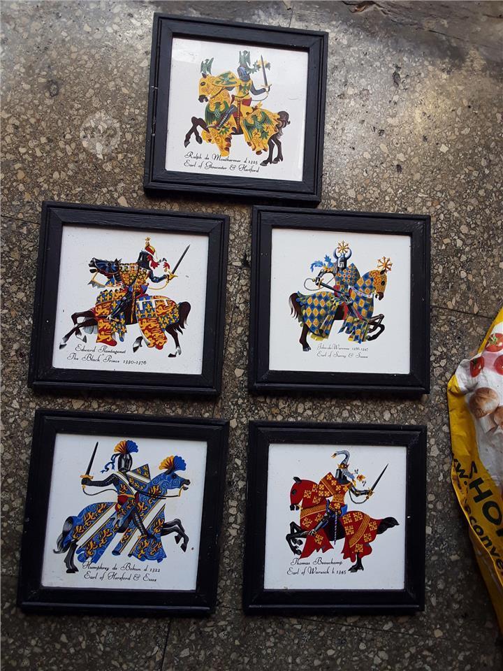 Set of five old framed tiles depicting medievel armoured English soldiers on horseback