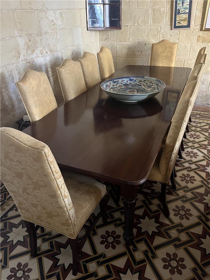 A beautiful, solid wood dining table (303 x 114 x 76cm) with 10 chairs and 2 carver chairs in beautiful gold fabric. Great condition. Pick up from Lija. Message me on 99346616.