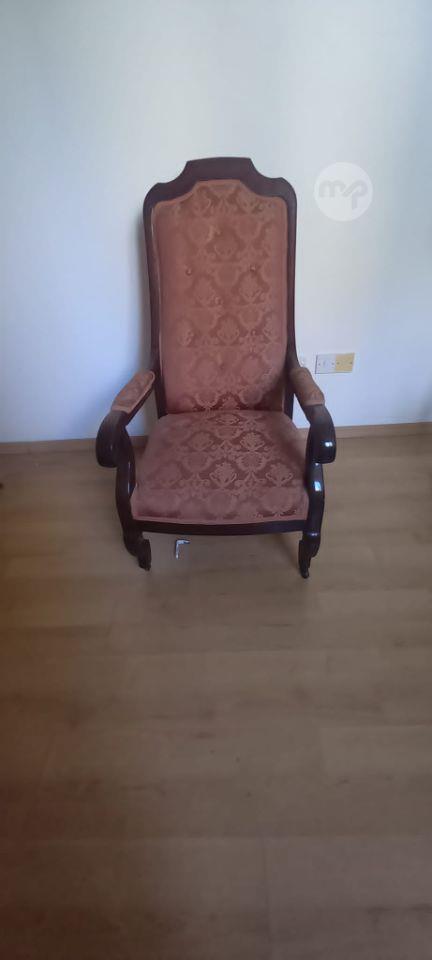 A Victorian vintage-style upholstered armchair with wooden arms and legs, featuring a tall backrest and patterned reddish fabric.