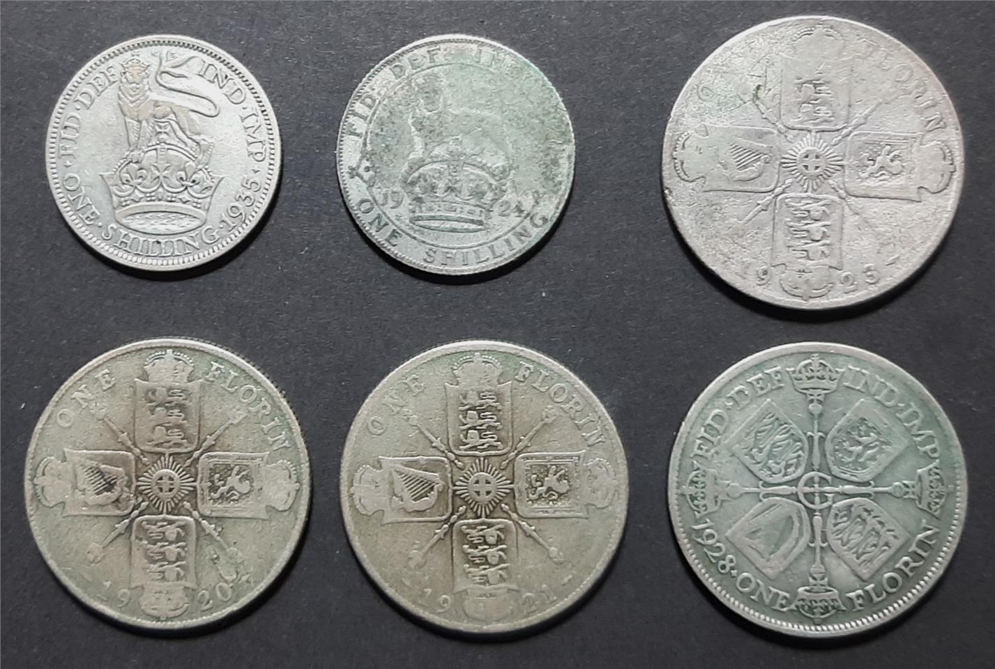 6 KING GEORGE V SILVER (.500) COINS - 2 ONE SHILLING and 4 FLORINS (TWO SHILLINGS) - 54.7g