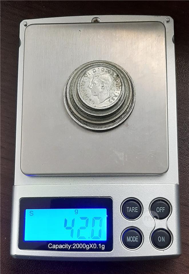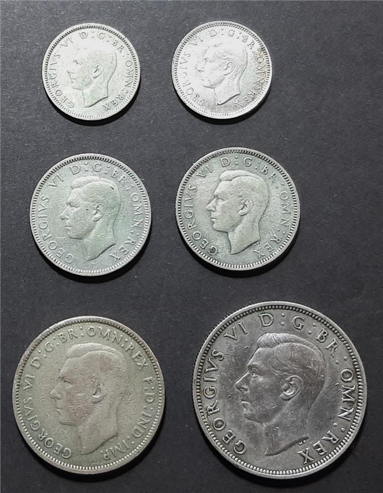 6 KING GEORGE VI SILVER (.500) COINS - 2 SIXPENSES, 1 AUSTRALIAN FLORIN and 1 HALF CROWNS - 42g
