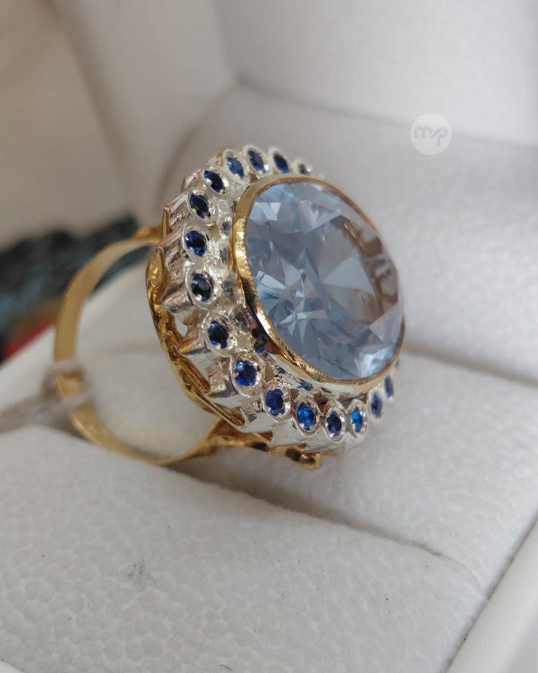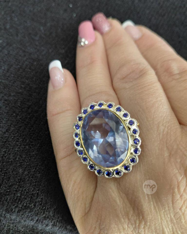 A 9 Crt Gold large Cocktail Ring with Central 14 crt Topaz, surrounded with 1.10 crt Sapphires