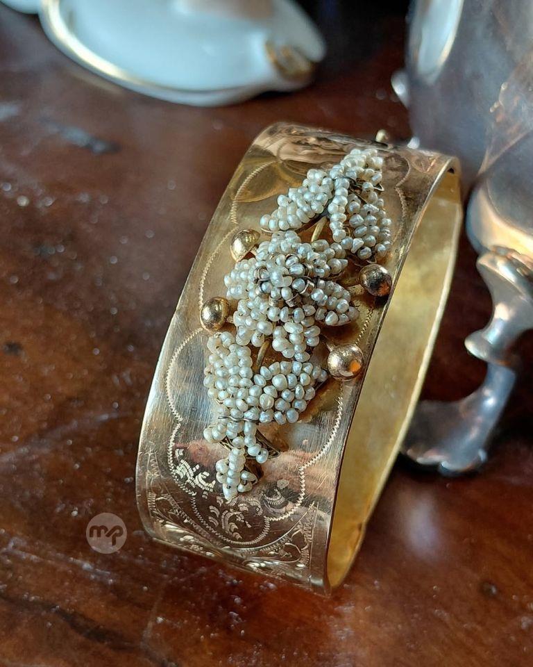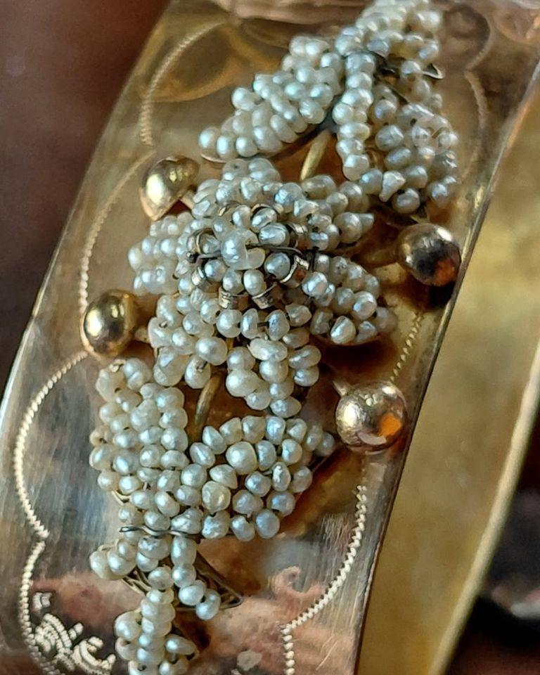 Decorated with flowers and foliage Engravings and adorned with strings seed pearls jewellery