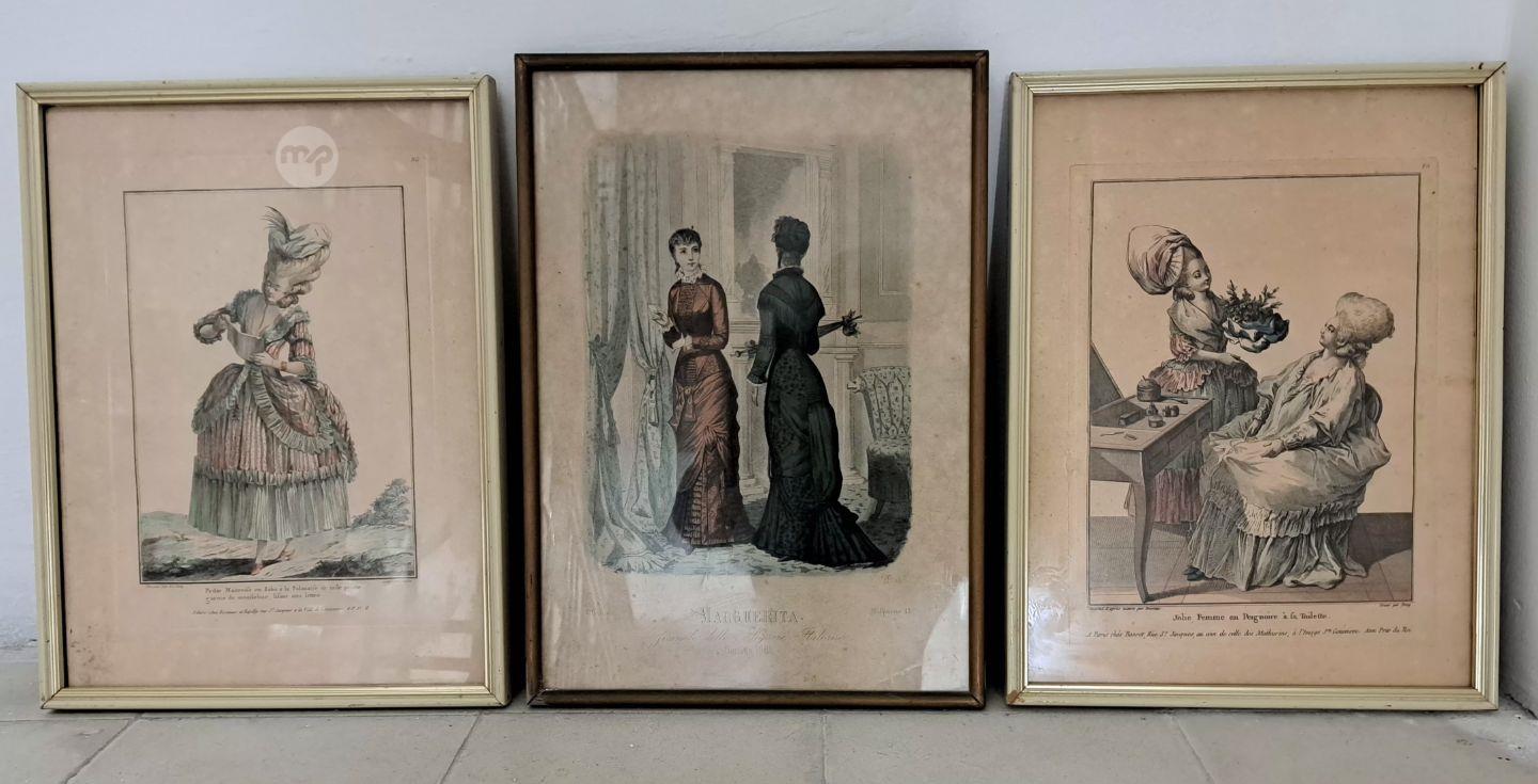 A set of 3 framed pictures depicting people in Period costumes. Eur 25 for the set.