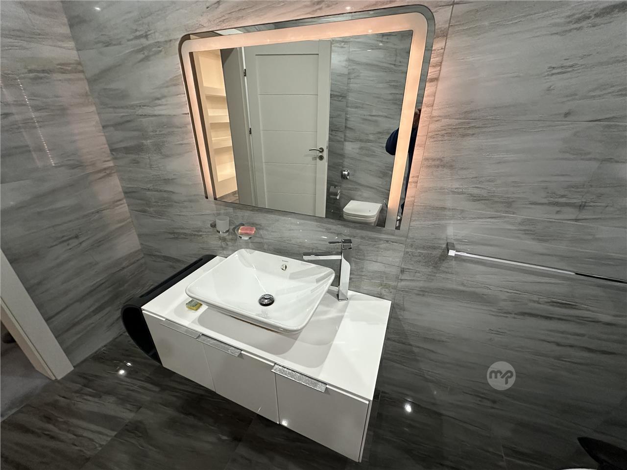 Stylish bathroom vanity unit in good condition, featuring a sleek white cabinet with integrated sink and a modern LED backlit mirror for a contemporary look.