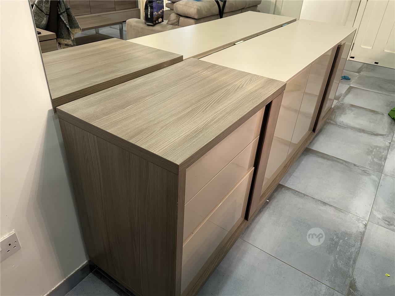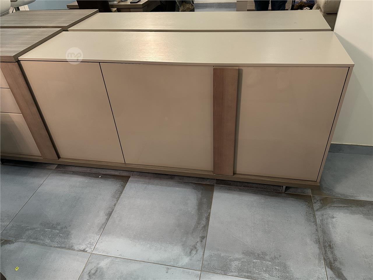 • Modern beige finish with wood detail handles