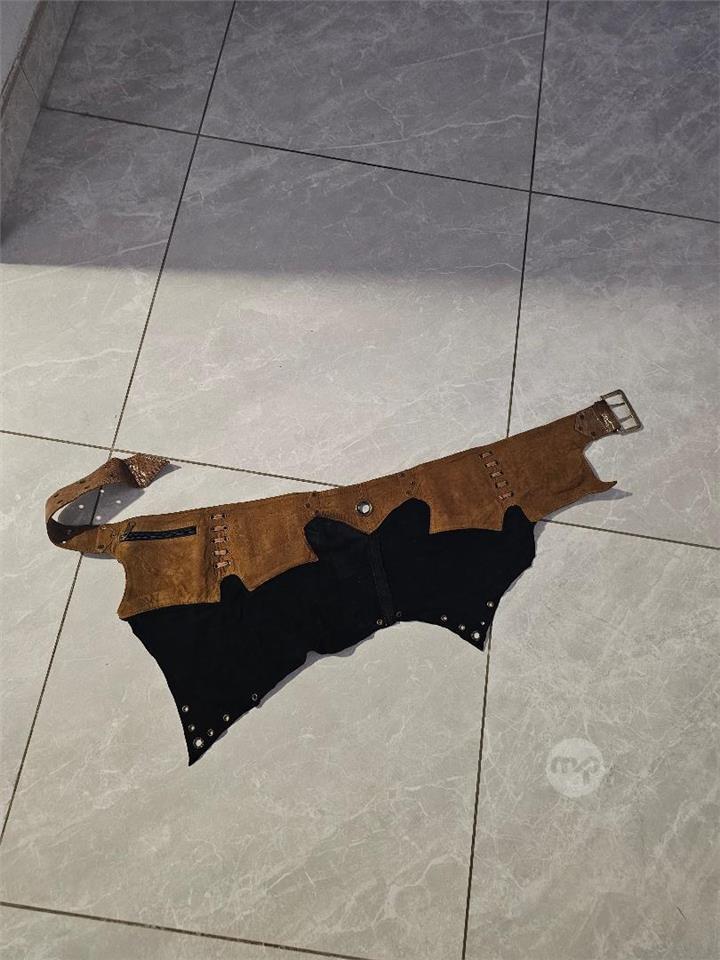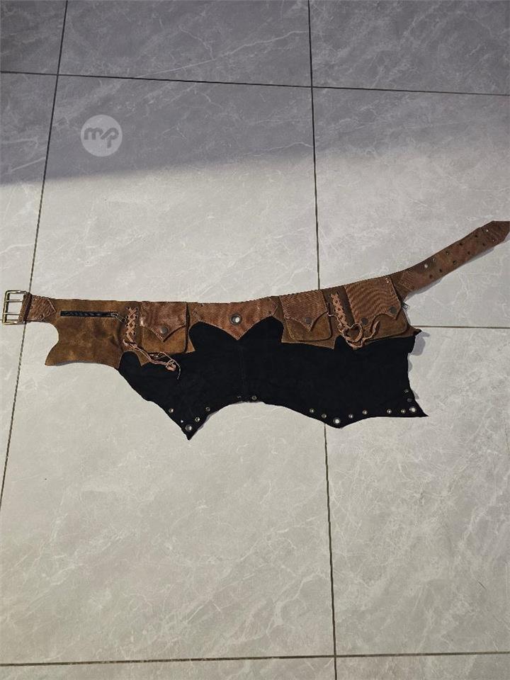 A unique, handcrafted leather utility belt in a distressed brown and black "leaf" design. This adjustable hip bag features multiple functional pockets with buckle and snap closures, perfect for keeping your essentials hands-free at festivals, fairs, or while traveling.Features: