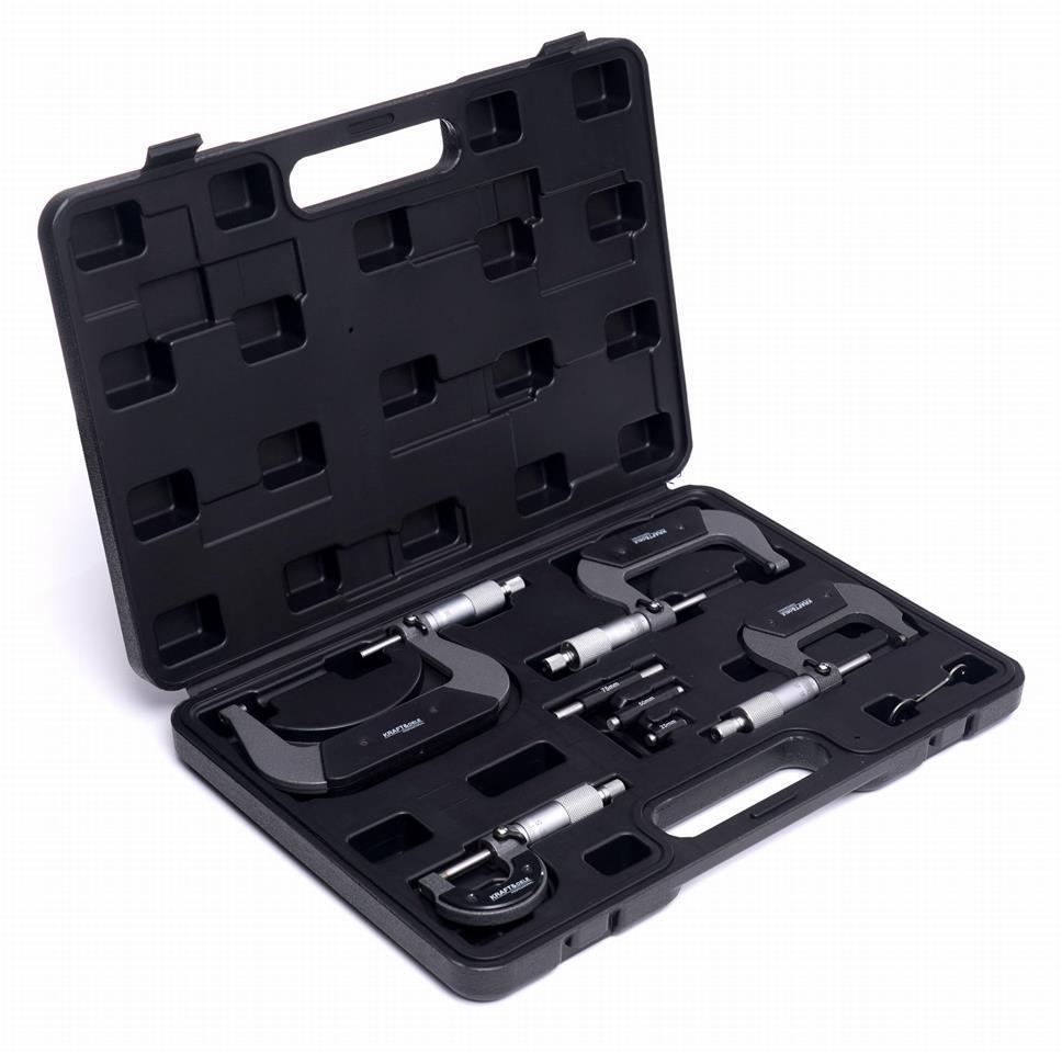 The set includes four micrometers covering the full 0–100 mm range, along with control gauges, allowing for quick and accurate device setup. Thanks to their robust construction and precise measuring elements, KRAFT&DELE micrometers guarantee long-lasting and reliable operation.
