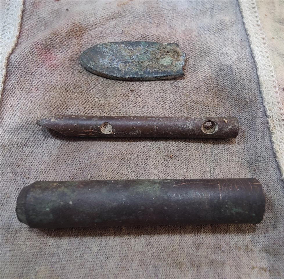 Military parts. The 2 round objects look like copper/ bronze. They need to be cleaned.
