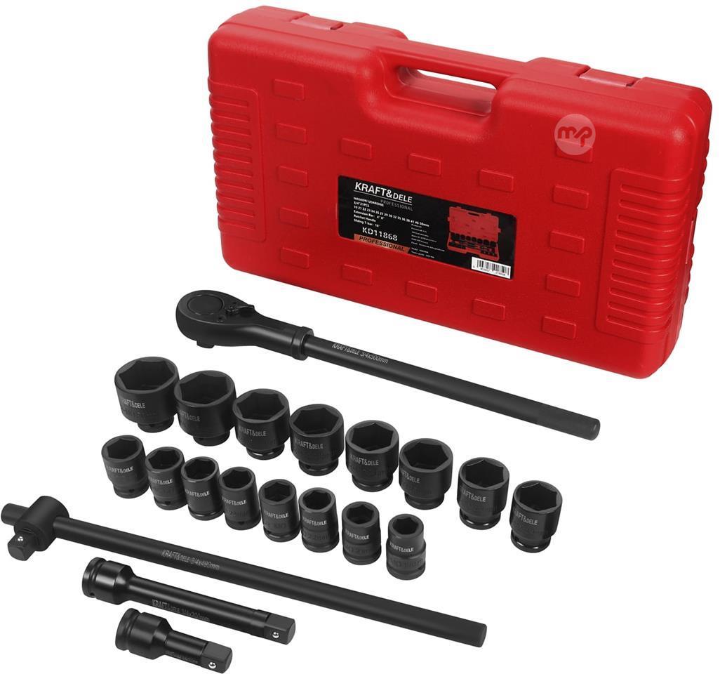 The KD11868 is a professional impact socket set from KRAFT&DELE, designed for heavy-duty workshop and industrial use. With a 3/4" drive and a wide range of sizes, the set is ideal for handling large screws, nuts, and fasteners requiring high torque. The sockets are made of durable chrome-molybdenum (Cr-Mo) steel, ensuring resistance to heavy loads and long life in everyday use.