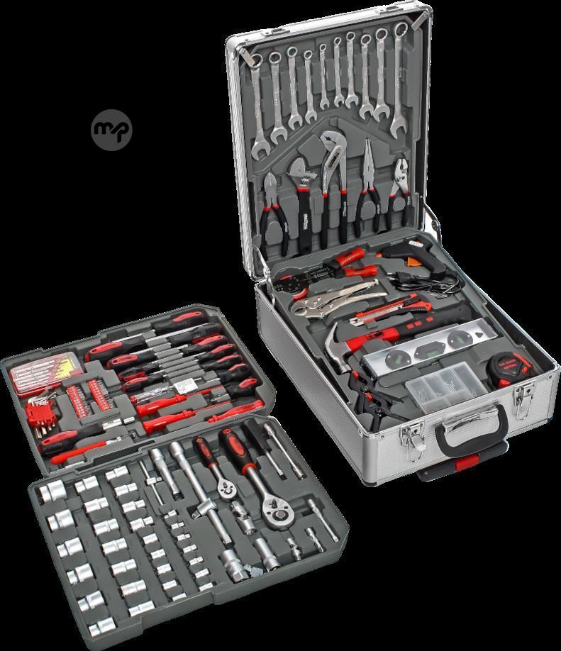 flat and socket wrenches, a ratchet, a hammer, a set of pliers, spirit levels, clamps, a measuring tape, insulating tape, a knife, a set of nails and screws, as well as screwdrivers and bit tips.