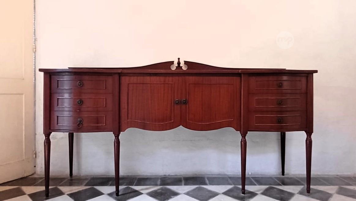 Elegant vintage wooden sideboard with a rich mahogany-toned finish, six drawers, and a central double-door cupboard. A practical and decorative statement piece, ideal for dining rooms, hallways, or traditional interiors. Measures 199cm x 47cm x 98cm. Pickup from a 1st floor townhouse in Paola.