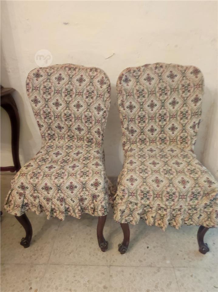 A classic vintage-style living room suite consisting of one three-seater sofa, two armchairs and two matching side chairs. The pieces feature solid dark wood frames with elegant curved lines and carved detailing on the legs and lower rails. The chairs have cabriole-style legs and decorative carving along the front apron.