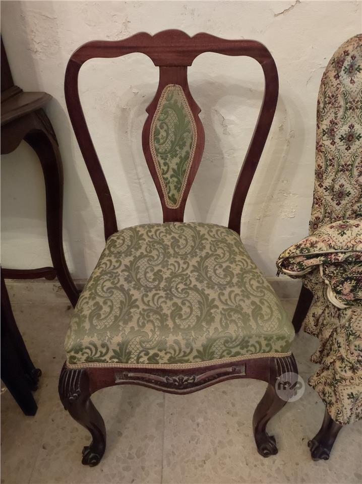 The upholstery is in a green patterned fabric with an ornate, traditional motif. The side chairs have an open, shaped backrest with a central upholstered panel that matches the seat fabric.