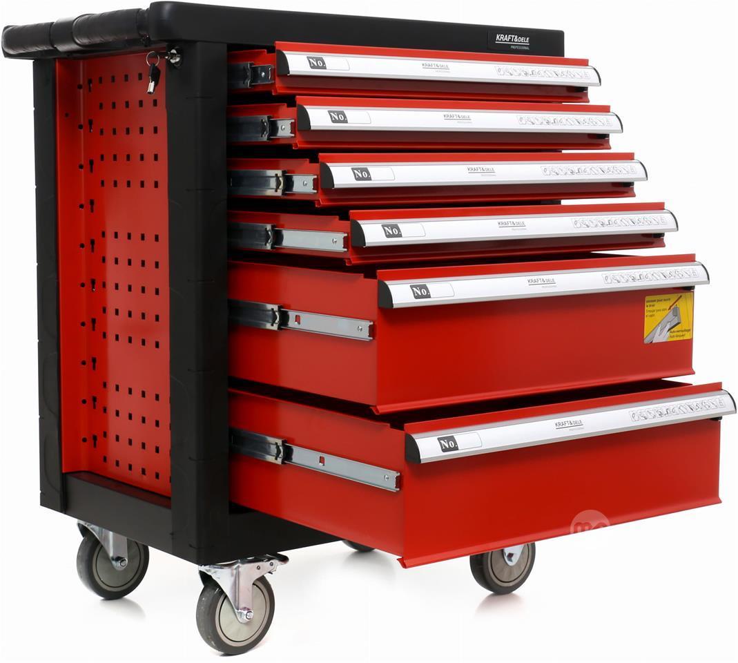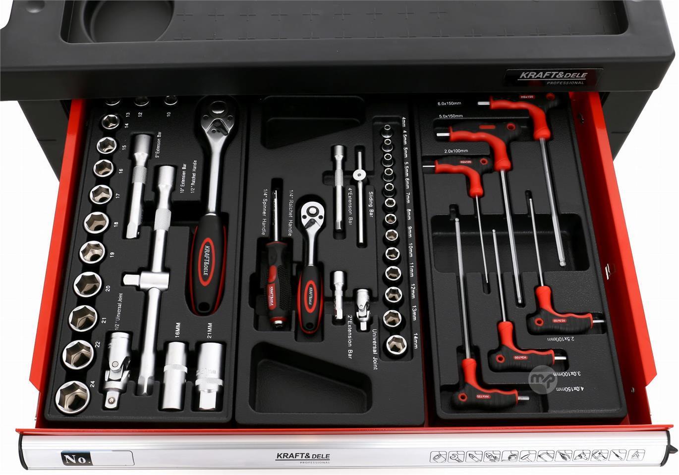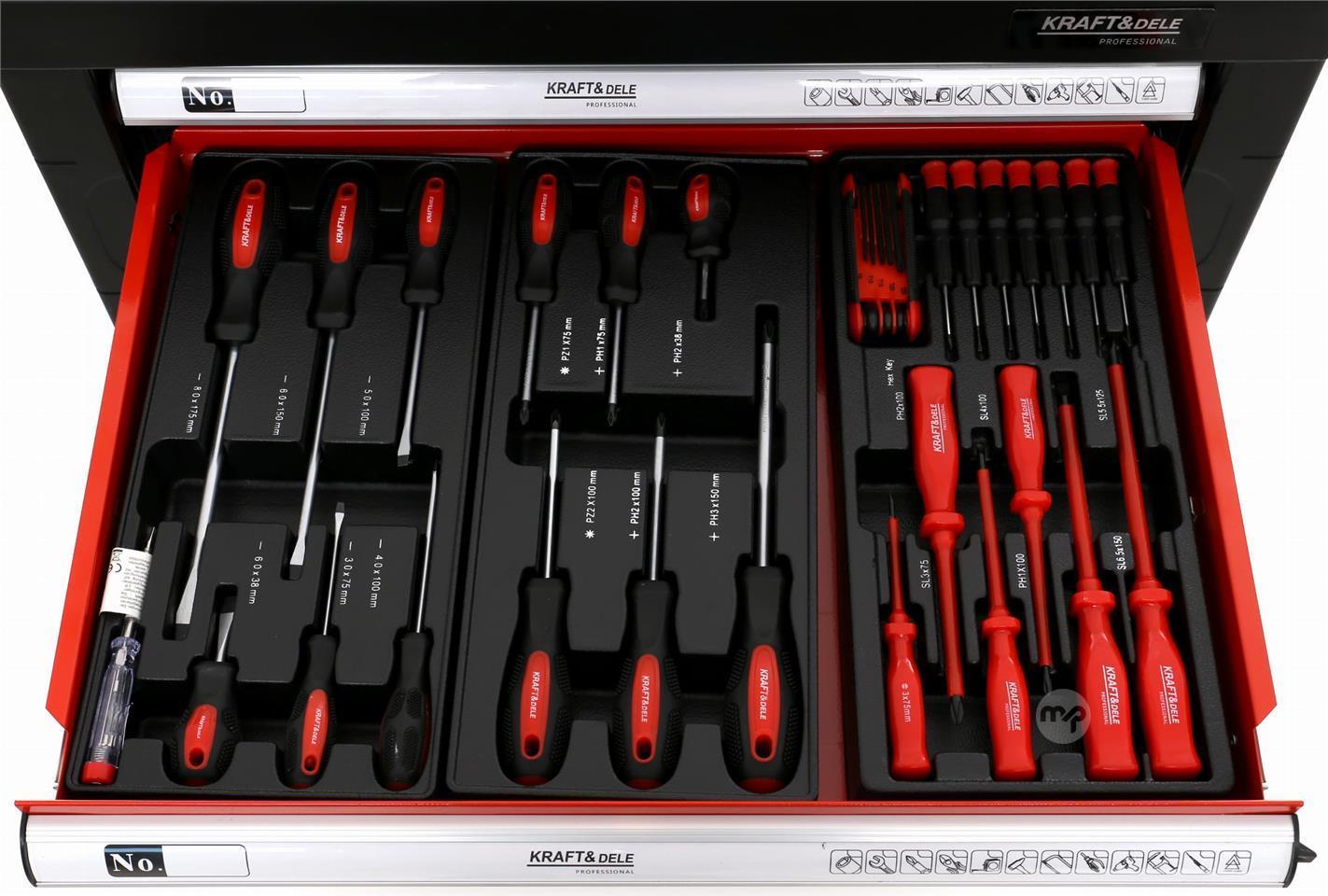The KD361 is a professional tool cabinet from KRAFT&DELE, ideal for automotive workshops, service centers, and home garages. Equipped with 263 high-quality components and six spacious drawers, it provides a complete set of tools essential for everyday work for mechanics and DIY enthusiasts.