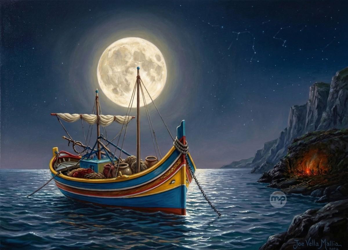 MOON LIGHT ON THE LUZZU ---- ORIGINAL HAND PAINTING OIL ON CANVAS 70X50