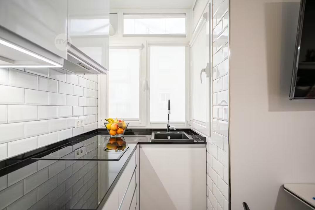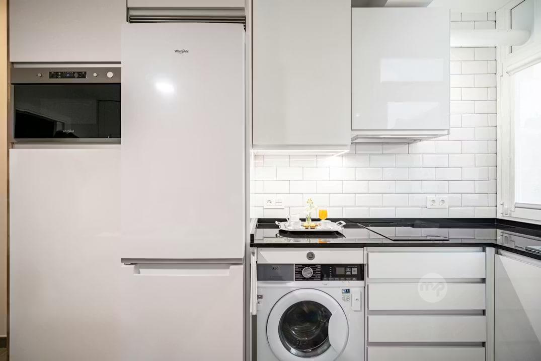 The apartment features modern furniture, two large wardrobes, a high-quality bed with memory foam mattress, and a 50-inch LED TV. A fully equipped kitchen includes premium, energy-efficient appliances such as a washer-dryer, induction hob, microwave, and fridge.