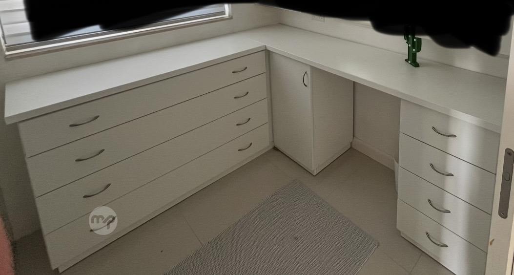 White corner 4 drawer and 4 smaller drawers + one door cupboard. surface width 196cm x 167cm and surface depth 45cm drawers soft close. Dismantles in two pieces. €100