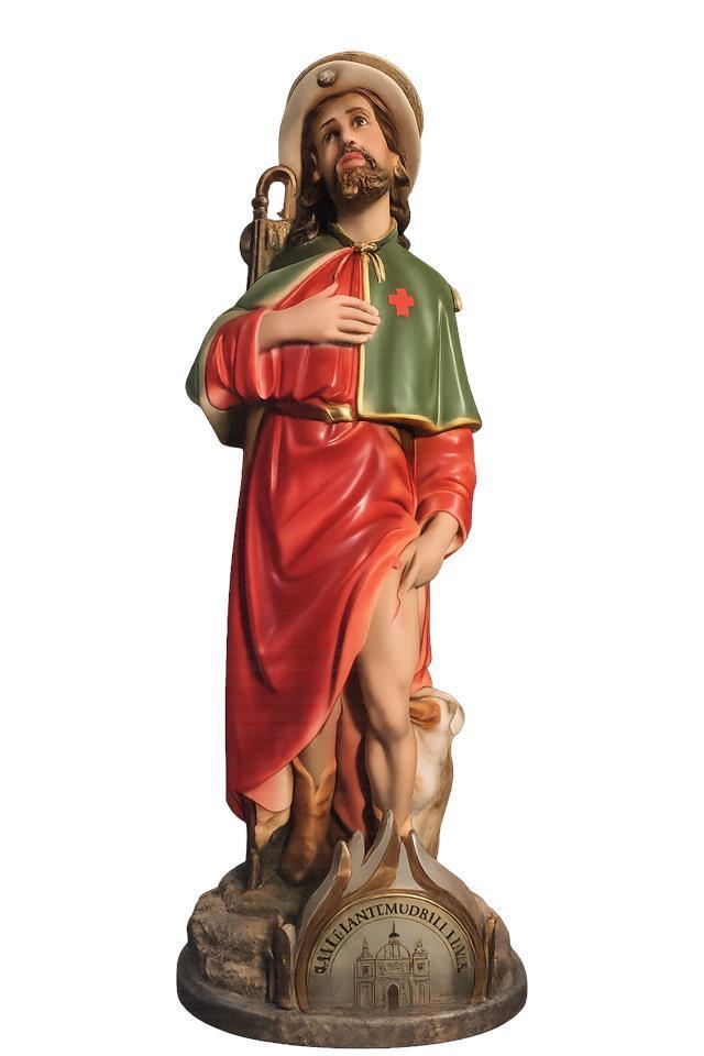 Beautifully detailed resin statue of Saint Roch, the patron saint invoked against plagues and contagious diseases. The figure is depicted in traditional pilgrim attire, with staff and hat, and the characteristic exposed leg symbolizing his suffering and faith.