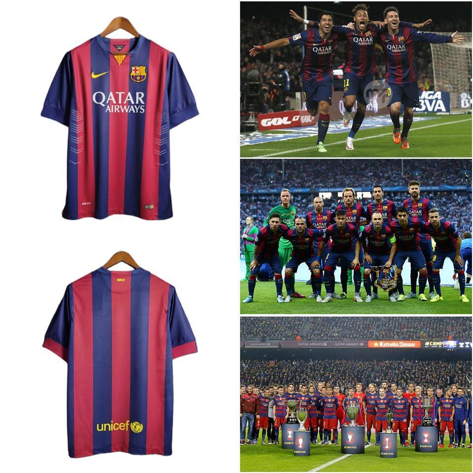 Barcelona 2014/15 Iconic Jersey. The birth of MSN under Manager Luis Enrique. This kit was worn by the attacking trio Stars Lionel Messi Neymar Jr and Luis Suarez. One of the greatest seasons where Barcelona won the Treble.
