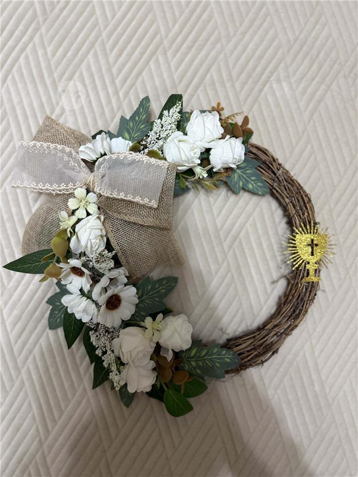 handmade wreath designed especially for First Holy Communion celebrations. Features soft white flowers, natural greenery, and a rustic burlap bow, beautifully accented with a gold cross symbol.