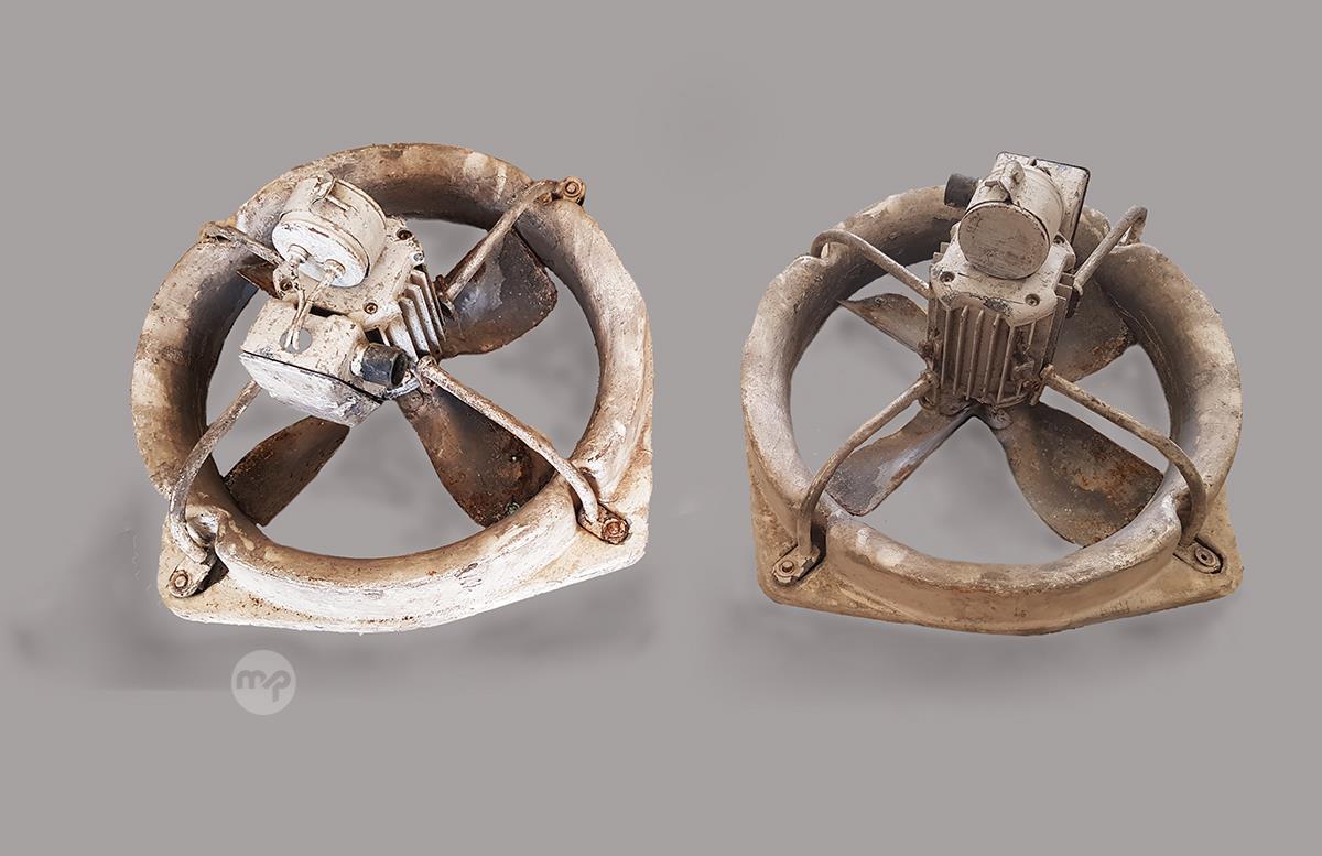 Two extractor fans with surround, (14in dia) condition as is (in need of cleaning and painting) but still in working order. Price for both.