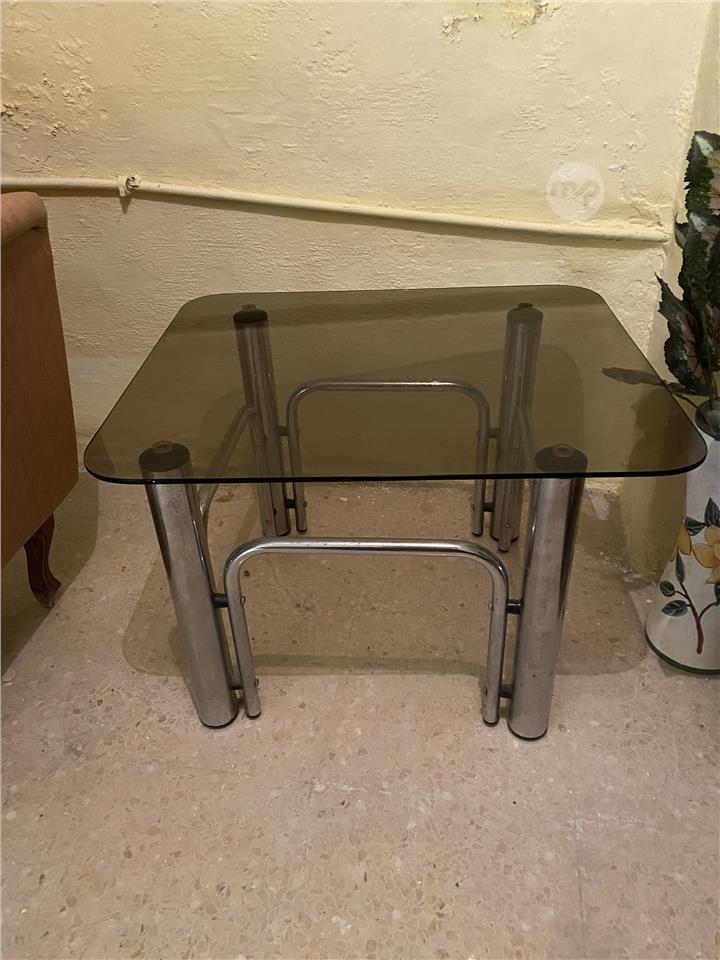 Used but still in good condition, camel colour sofa and armchair, wall unit (without the items on the shelves), silver aluminium coffee table with glass top. Price is for all items but can be bought separately.