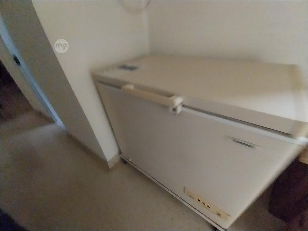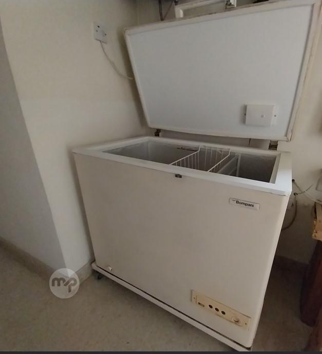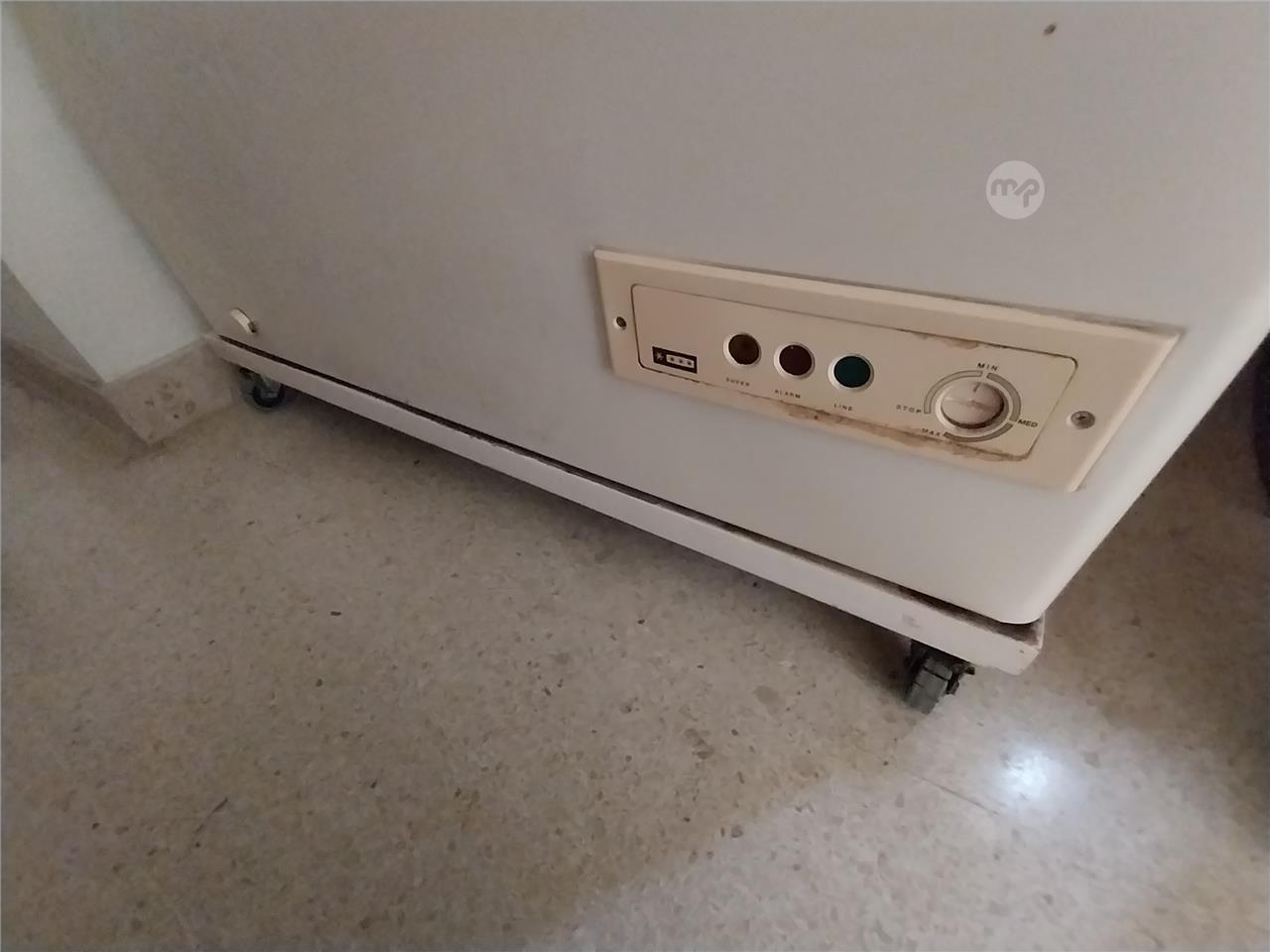 White chest freezer on a wooden base (to keep elevated and easy to move) on wheels, as seen in picture. Ideal for home, garage, or small business use. Base and Freezer are detachable.