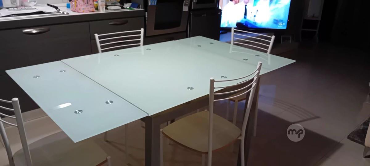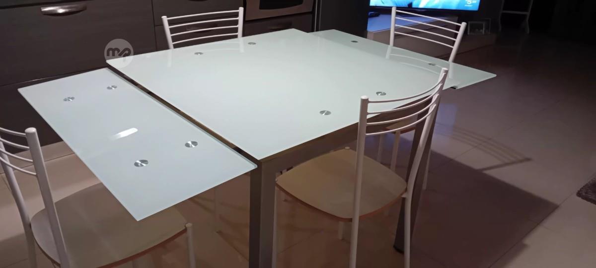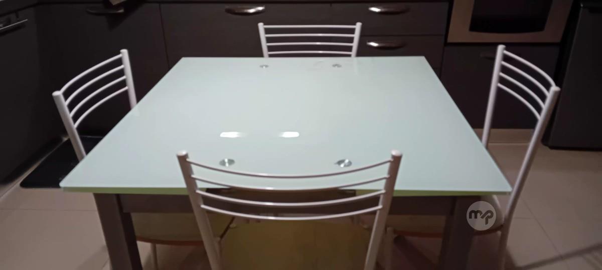 Extendible glass top kitchen table (90x90 cms) sits up to 6 persons plus 4 chairs in very good condition. Stylish, modern and easy to clean 😉