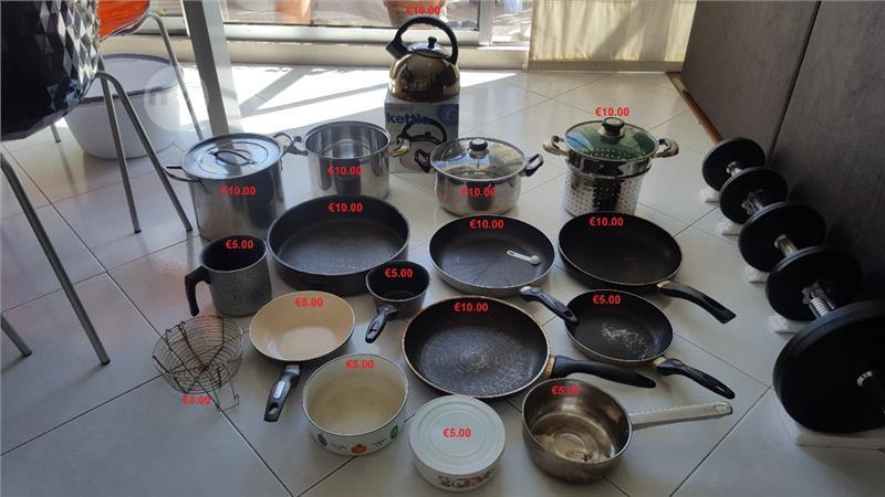6 Non Stick Fry Pan+1 Stainless Steel Fry Pan+1 Big Non Stick Fry Pan+2 Large Stainless Steel Pans+3 Smaller Stainless Steel Pans+2 Warmers+1 Fryer Net+1 Whistling Kettle Cook Cooking Dish Dishes