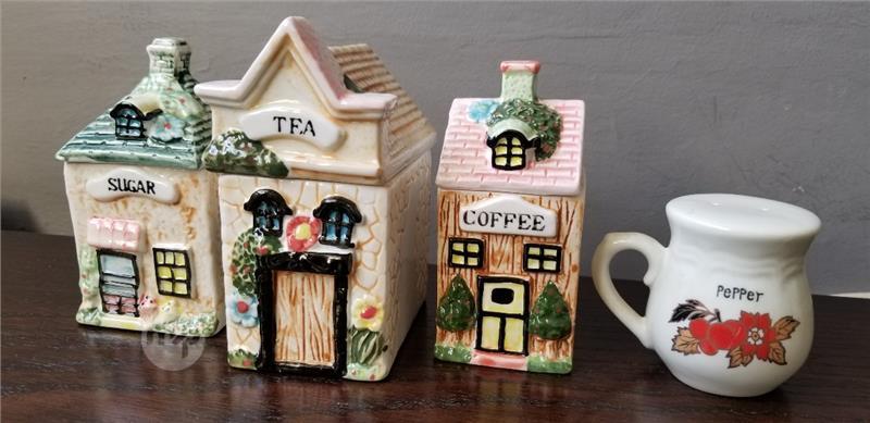 NEW Antique Vintage Maison Original Brand Est. 1852 Ceramic Porcelain Tea Coffee Sugar Salt Pepper Shaker Set House Collectables (7 pieces)