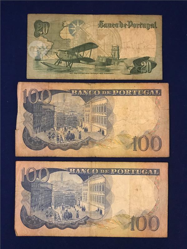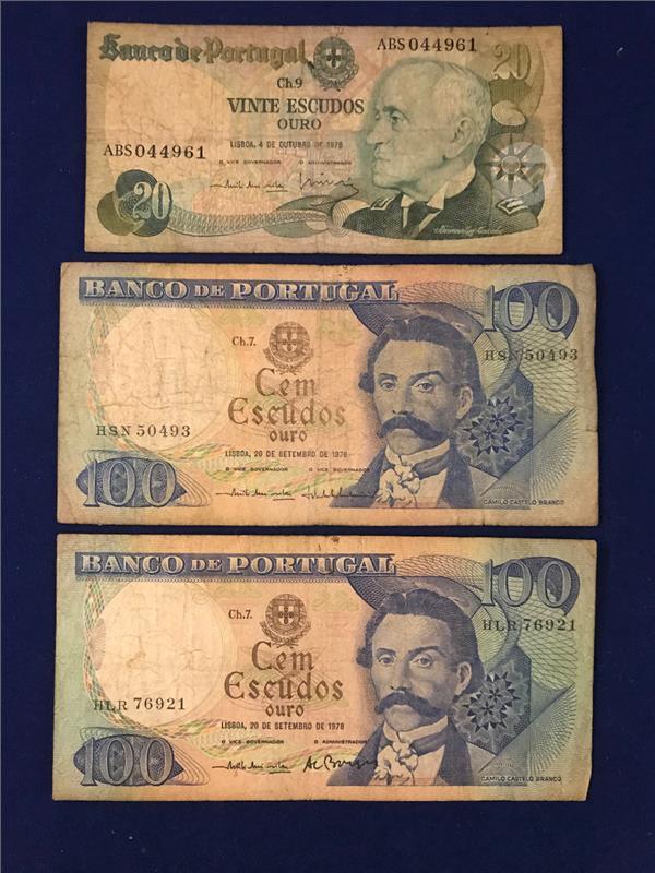 Banknotes: Portugal - 20 Escudos and two of the 100 Escudos - 1978