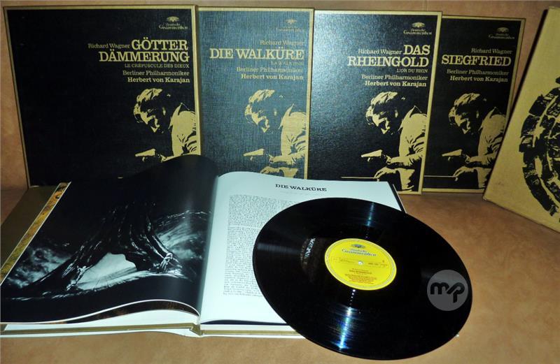 a box set of 4 different wagner operas in german language consisting of 19 L.P.s and a libretto of all four in English language