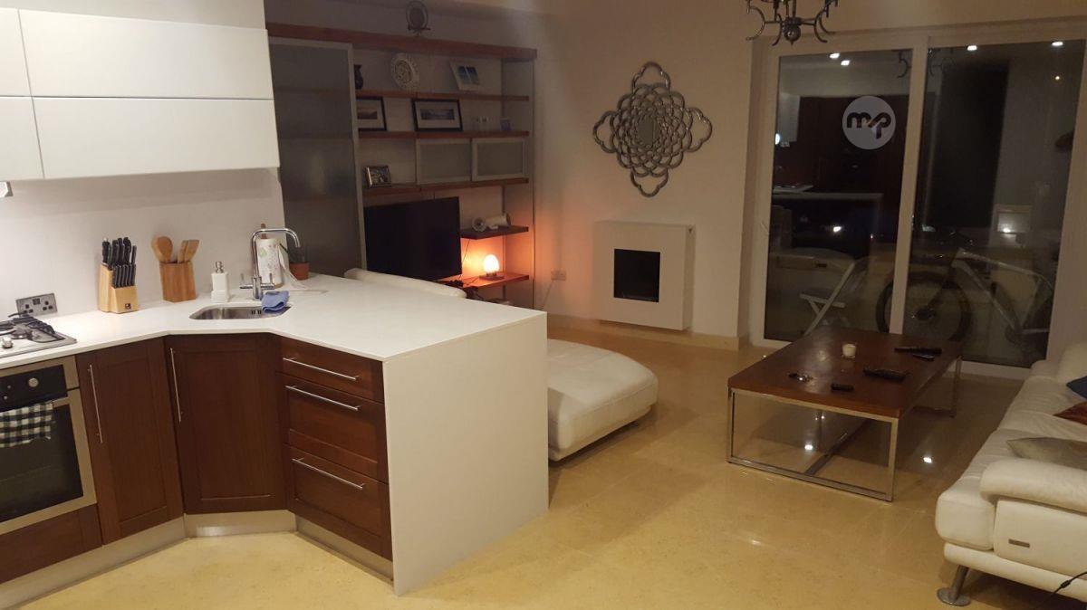 Three bedroom with marble floors and underfloor heating. PVC windows. LED lighting 2 bathrooms, and open plan kitchen with squarish layout.