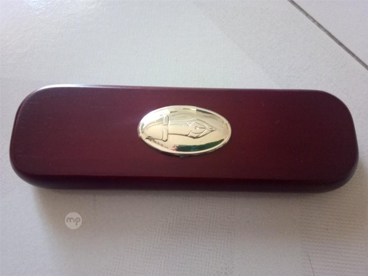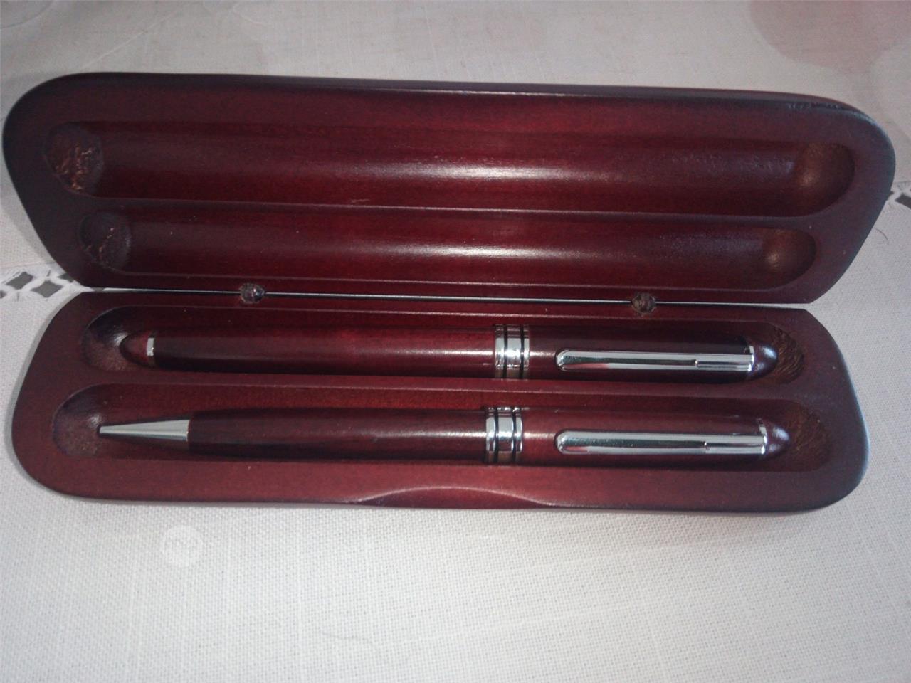 TWO PEN SET IN A WOODEN BOX DECORATED WITH A SILVER NIB MOTIF