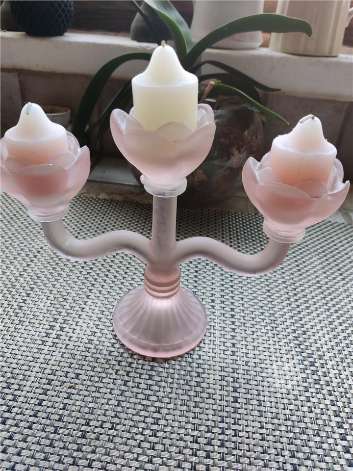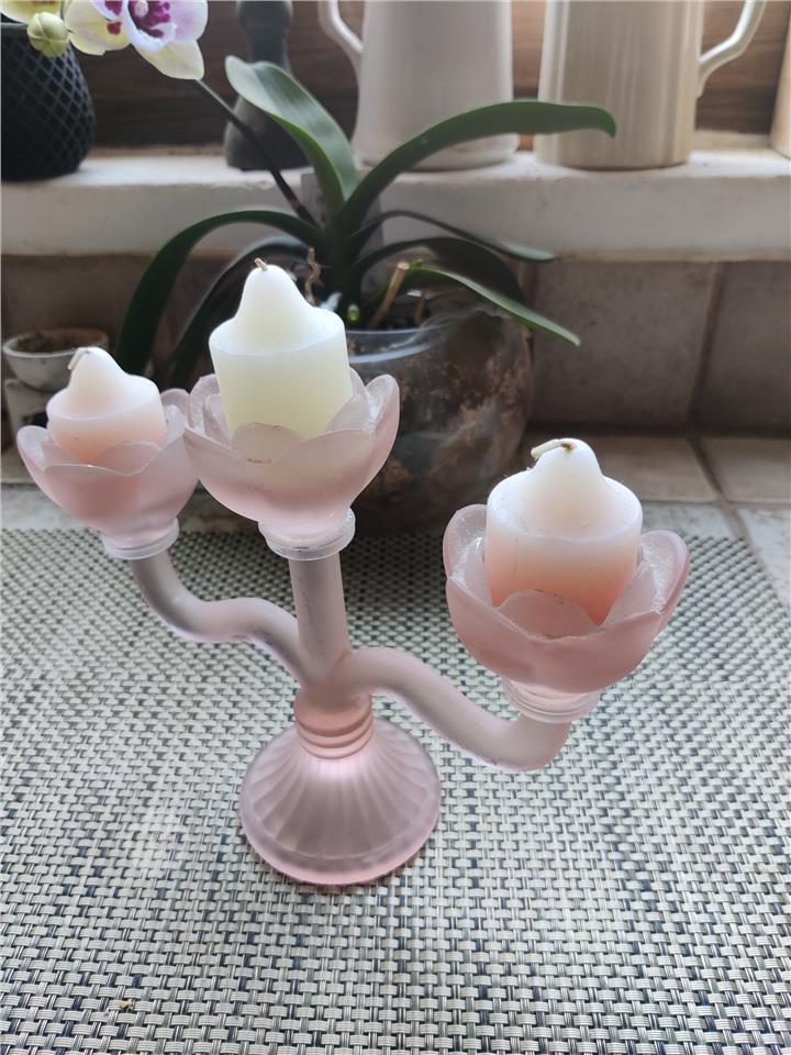 Vintage Frosted Soft Pink Glass Candle Tea holder / Candelabra with three flowered shaped scones in Perfect Condition