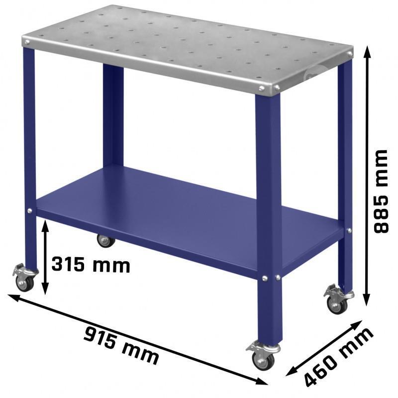 The compact and solid structure of the table allows for a very wide range of applications. Starting from welding, through locksmithing, to grinding and other processing of details. Thanks to the use of a lower shelf for handheld devices and accessories, it becomes an indispensable device in every garage or workshop. THE TABLE TOP HAS A THICKNESS OF UP TO 4 mm Welding tables in system 16 allow the use of many additional accessories, such as: screw clamps ratchet clamps mounting columns widening feet locking pins bumpers angular handles Front part is made of thick, 4 mm thick galvanized steel. The primary purpose is welding aluminum, stainless steel or carbon steel from thin and thick-walled profiles. The solid device structure allows not only welding table use, but also locksmithing and repairs with the use of physical force. Parameters Dimensions (LxWxH) 915 x 460 x 885 mm Shelf height 310 mm Holes Ø16 spacing 100 x 100 mm - 45 pcs Lifting capacity 540kg TOP THICKNESS 4 mm