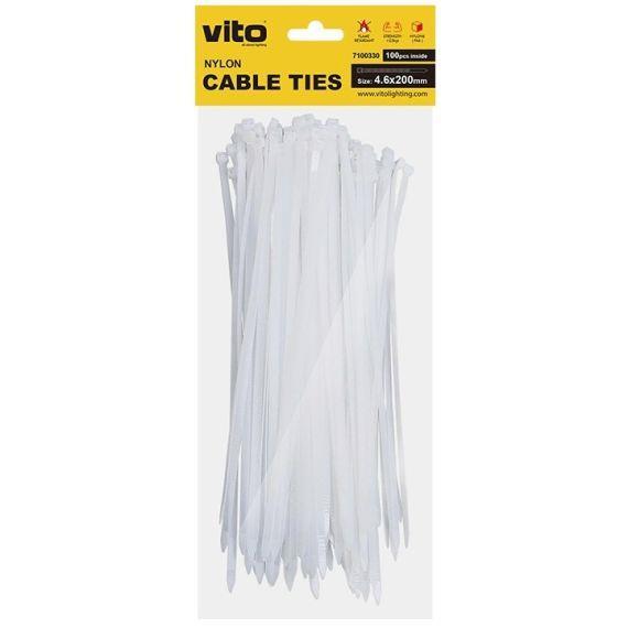 White Self-Locking Cable Ties4.6X200mm- 100 pieces VITO PLASTICK CABLE TIES made of NYLON6 (PA6) in WHITE color with UV protection and 22 kg tension test. The dimensions of a cable tie are 4.6X200 mm. Easy manual installation. Characteristics Brand Vito EAN code 6972538047618 Supplier code 7100330 Material NYLON6(PA6) Color White Dimensions (mm) 4.6X200 Temperature (Ta) 0-85?