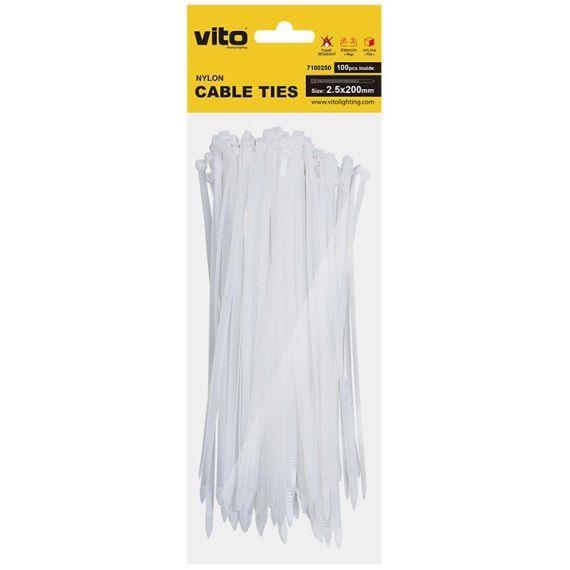 White self-locking cable ties 2.5X200mm - 100 pieces The VITO PLASTICK TIES made of NYLON 6 (PA6) are WHITE in color and have a tension test of 8 kg. There are 100 pieces in the package. The size of a tie is 2.5X200 mm. Characteristics Brand: Vito EAN code: 6972538047533 Supplier code: 7100250 White color Pack of 100