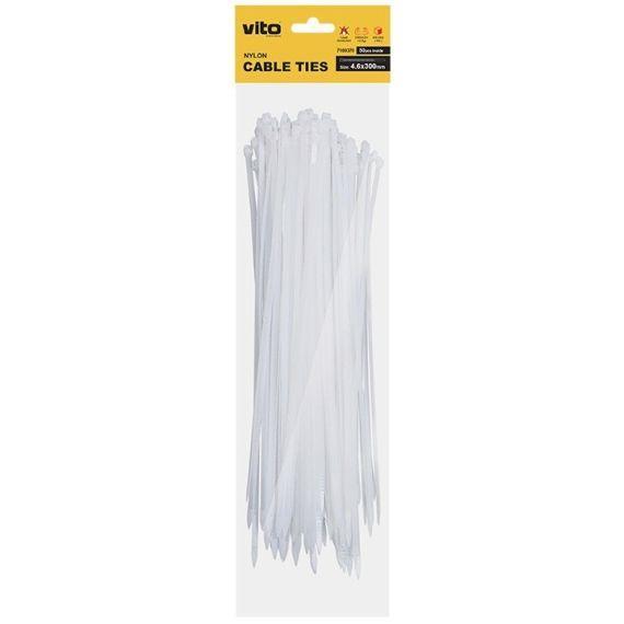 Self-locking cable ties white 4.6X300mm- 50 pieces VITO PLASTICK CABLE TIES made of NYLON6 (PA6) inWHITE color with UV protection and 22 kg tension test. The dimensions of a cable tie are 4.6X300 mm. Easy manual installation. Characteristics Brand Vito EAN code 6972538047656 Supplier code 7100370 Material NYLON6(PA6) Color White Dimensions (mm) 4.6X300 Temperature (Ta) 0-85?